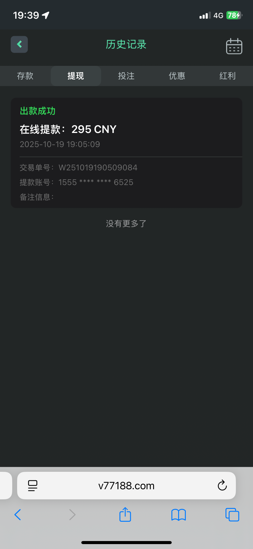 注册就送21,看不到流水,10倍流水,自己感觉到了问客服,回复有点慢多等等,我打的电子,棋牌捕鱼我进不去。出款295,最多出款300 人多必黄